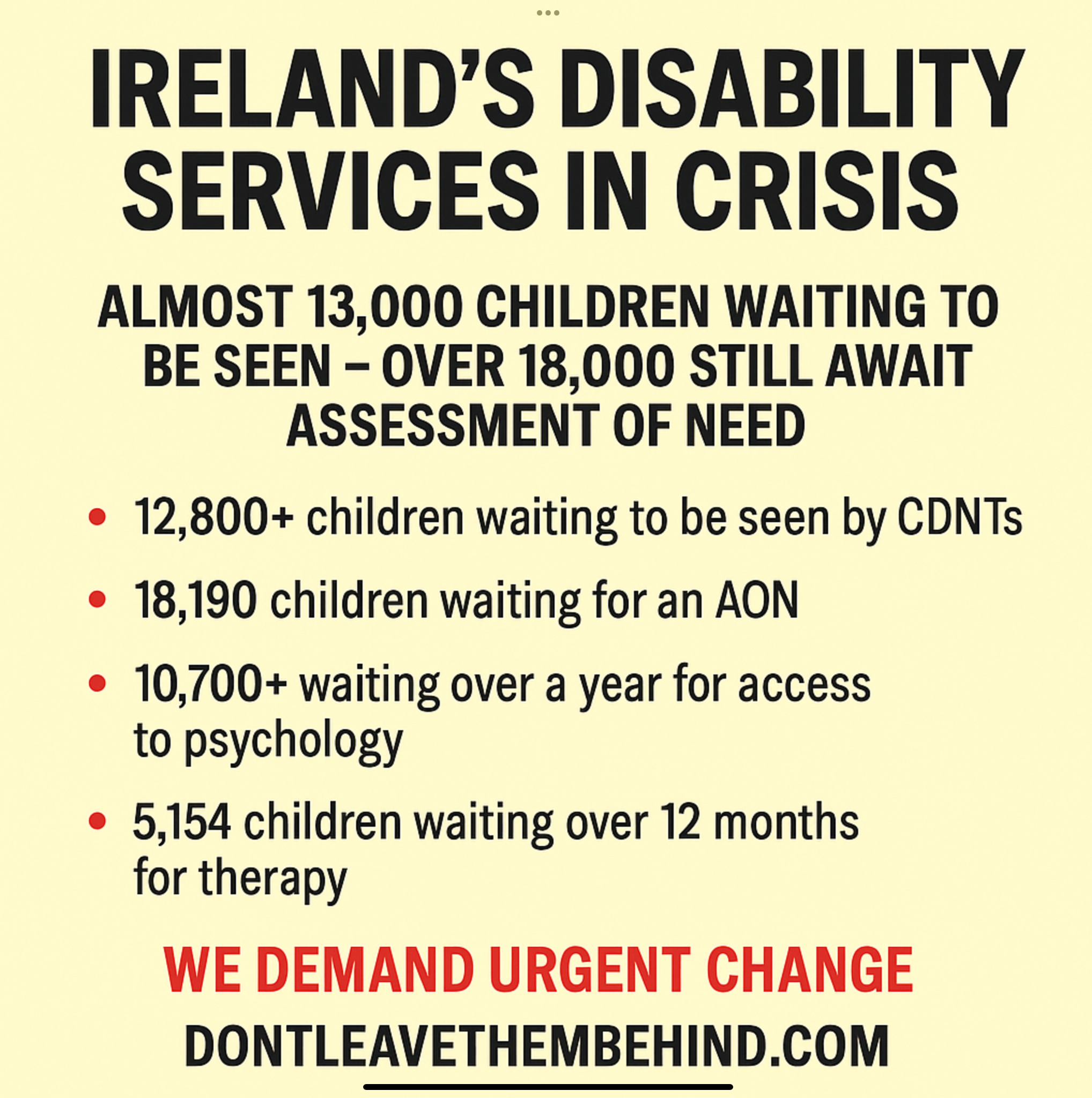 This is not just a service issue—it’s a rights issue. Every child has the right to timely support. Don’t Leave Them Behind is calling for a nationwide, fully resourced plan to clear waiting lists, hire more specialist staff, and deliver on Ireland’s legal and moral obligations to children with disabilities.